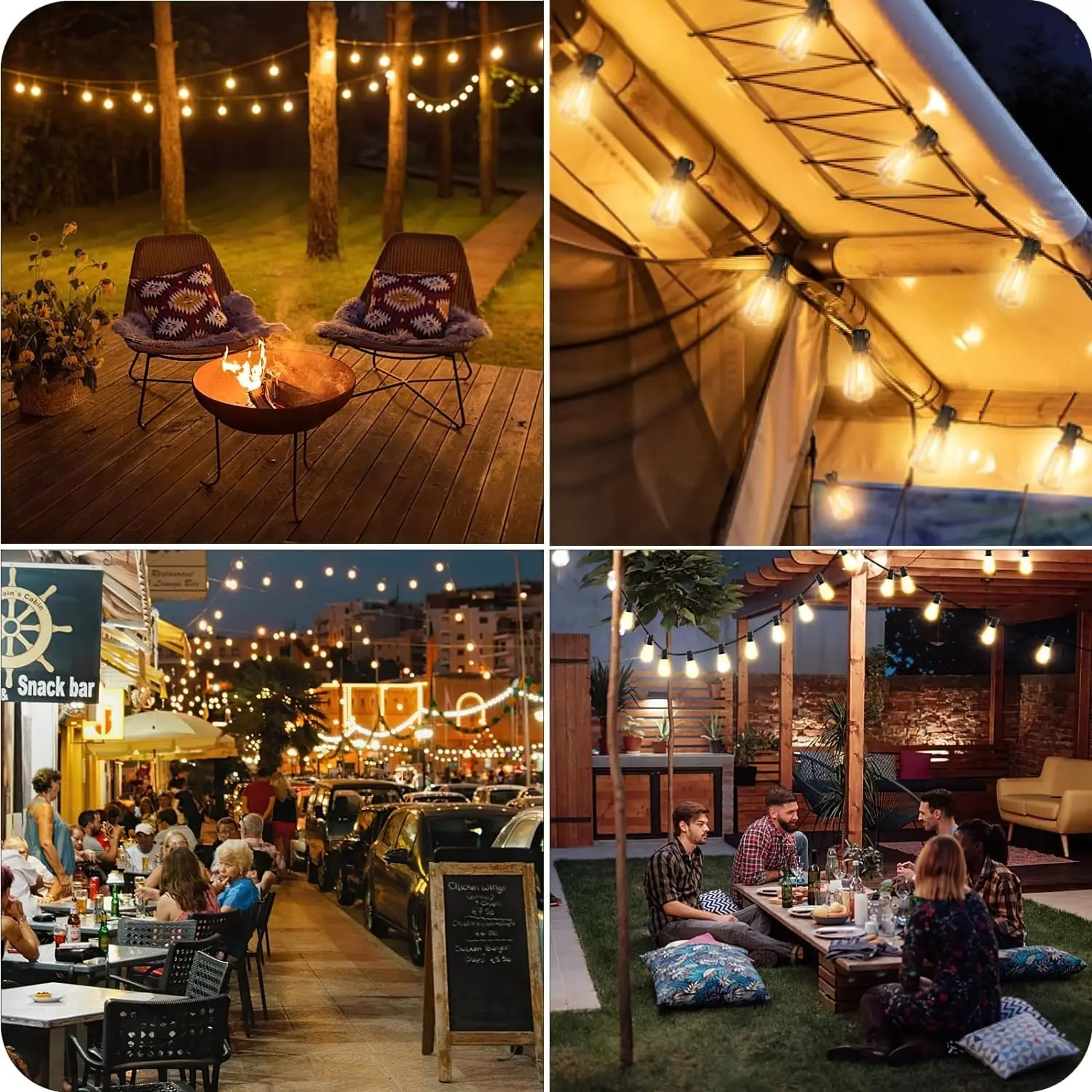 Outdoor solar lights string use vintage Edison bulbs, solar and USB charging available, install this hanging lights string as a canopy over your porch or gazebo for a retro bistro look and a pleasant party ambience; Make your space to be an enticing, relaxing and soothing retreat with our LED outdoor lights.